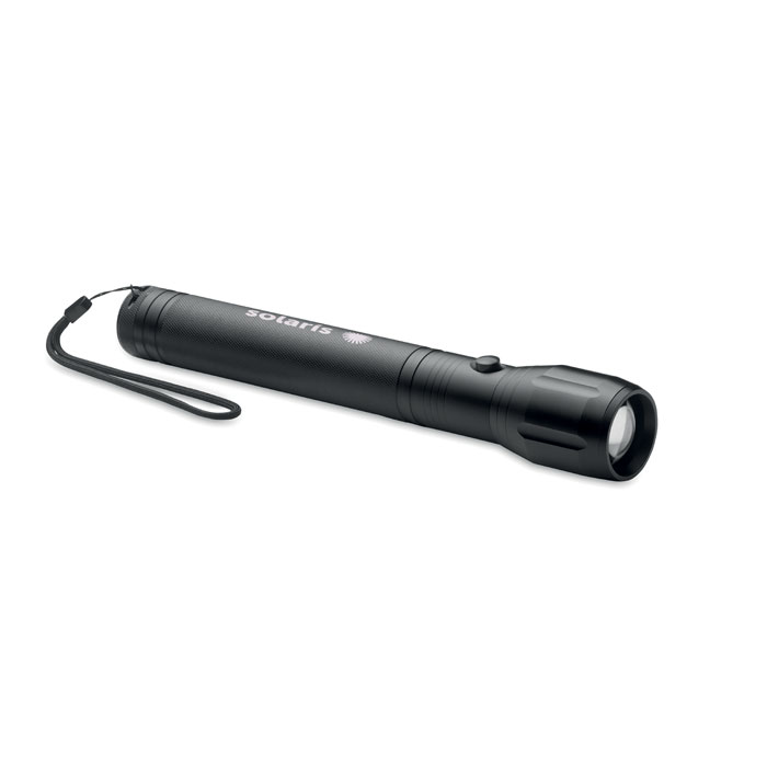 Grande torcia in alluminio con zoom, 1 LED e tracolla removibile. Potenza: 300 lumen. 3 batterie D escluse.