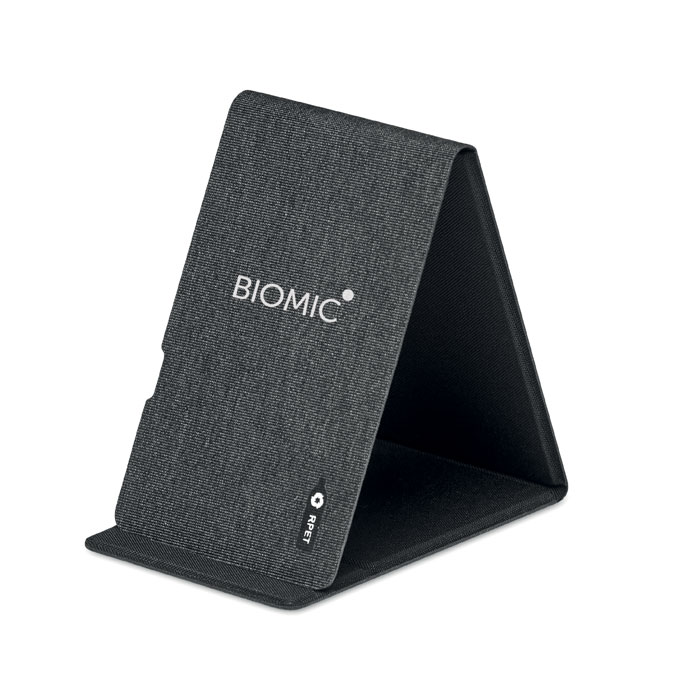 Caricatore senza fili in RPET 300D a due toni, con supporto per telefonocon ricarica wireless 15W. Uscita: 9V/1.1A (15W) per una ricaricarapida. Compatibile con gli ultimi Android, iPhone® 8 e più recenti.